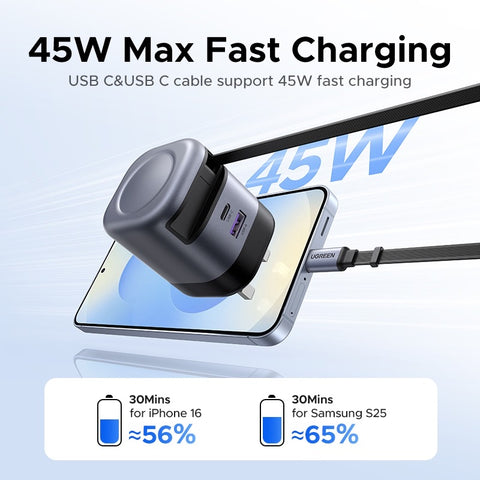 UGREEN 45W 3 Ports GaN Retractable 69cm Cable USB A USB C Fast Charger for iPhone 16 Pro Max,15,14